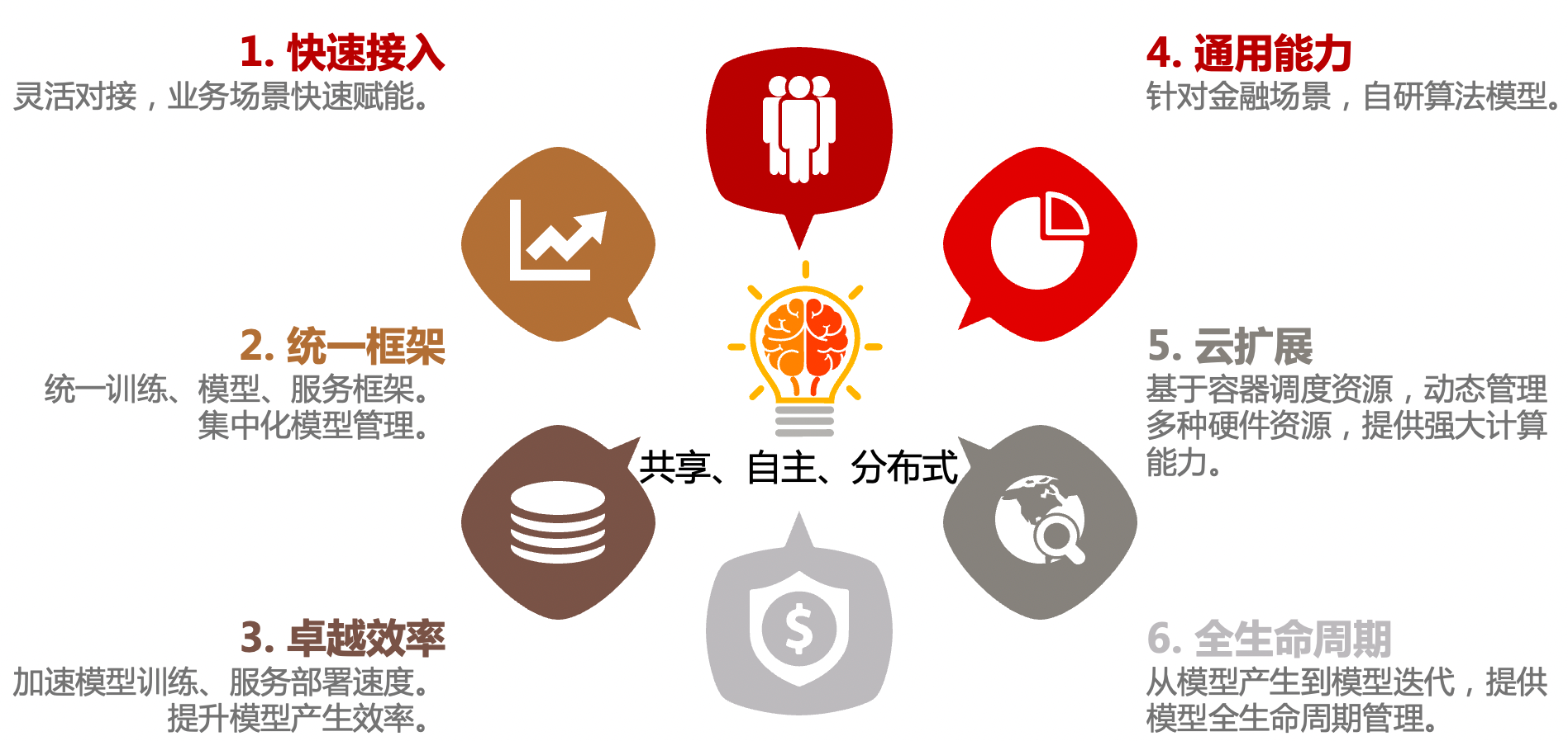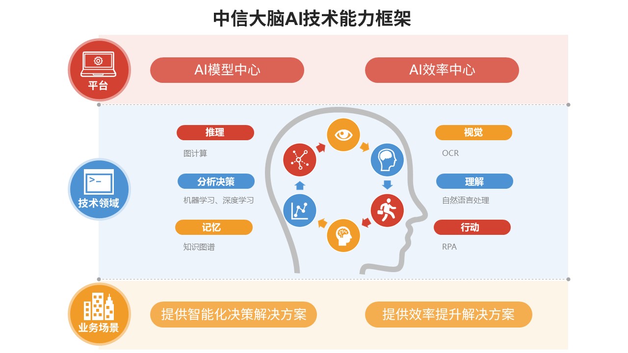 中信大腦平臺是面向未來云化架構,完全自主研發的人工智能開發部署平臺。該平臺提供可視化模型開發、分布式模型訓練、異構資源管理、模型管理、快速部署發布的全流程管理,為銀行場景提供機器學習/深度學習、光學文字識別、自然語言處理等技術的研發和服務能力。其中OCR服務體系應用于流水識別、智能審核等服務,模型準確率91%。表格識別模型準確率87%;NLP基礎中臺支持囊括目前NLP學術界工業界最新技術方案,支撐輿情事件引擎、風險監控、工單識撿,智能對話等場景。