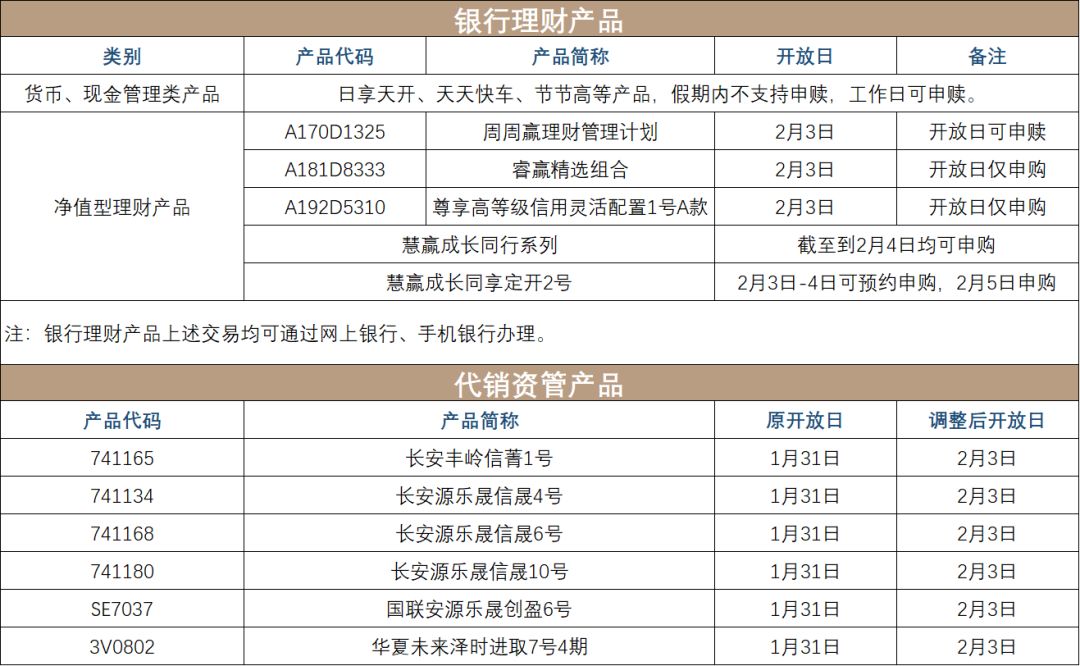 1.假期均為非交易日(1月31日-2月2日),上述交易的正式開放日將順延至下一個(gè)工作日,即2月3日。2.上述代銷資管產(chǎn)品,產(chǎn)品贖回可通過網(wǎng)上銀行、手機(jī)銀行辦理;產(chǎn)品申購須到柜臺(tái)辦理。