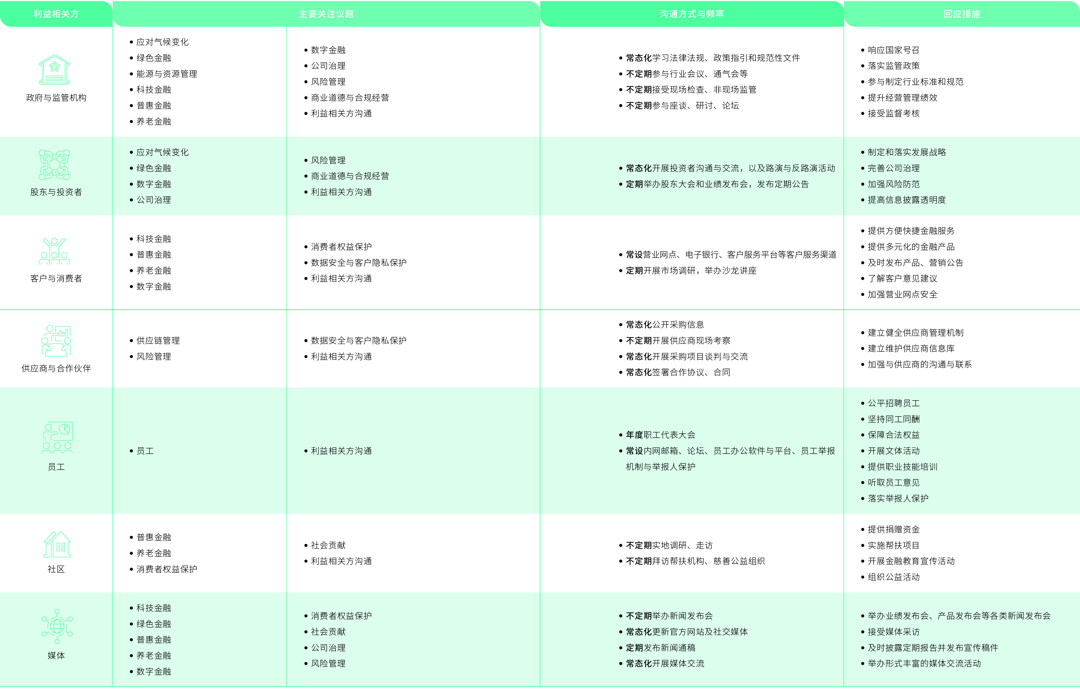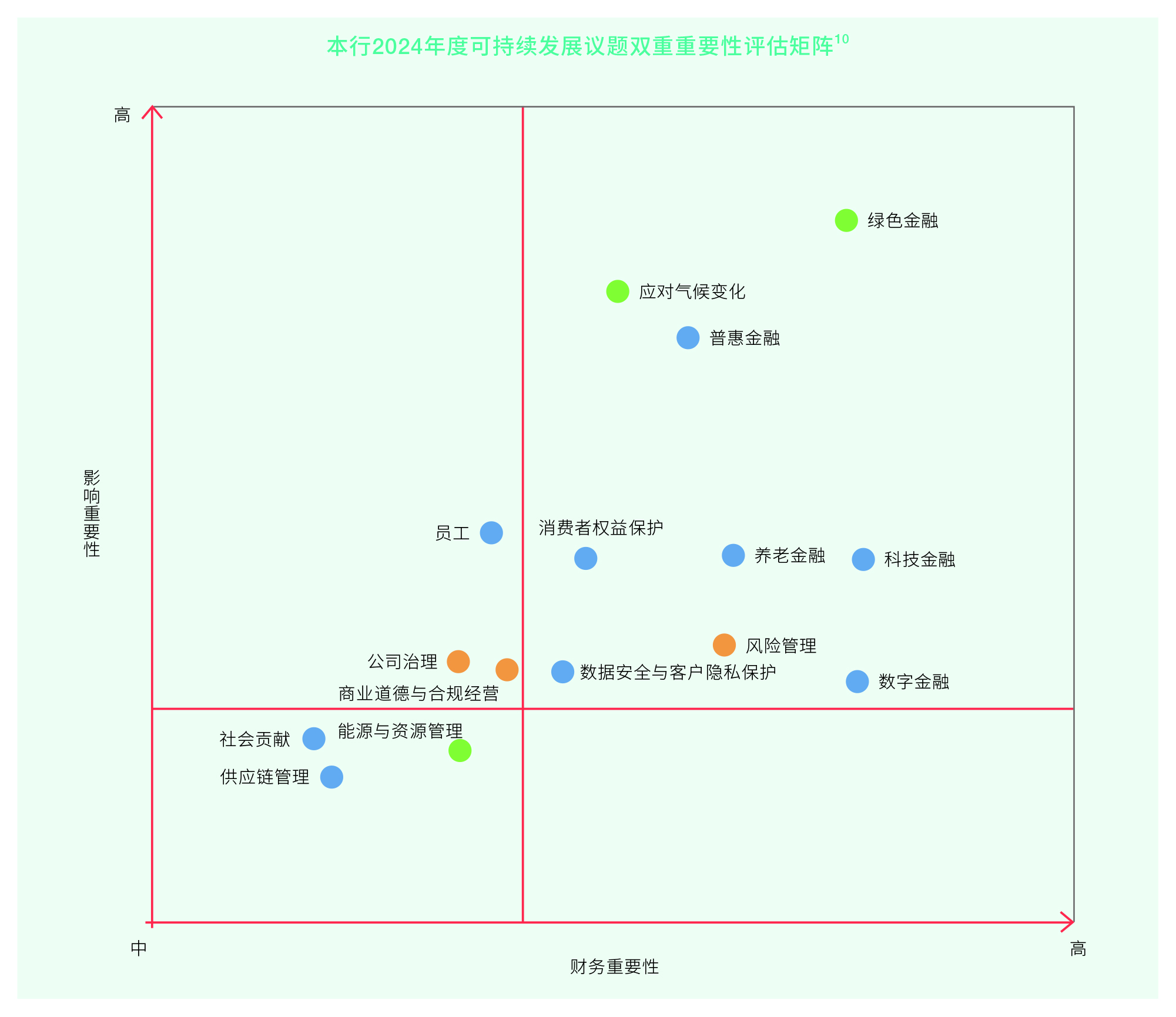 本行聚焦應(yīng)對氣候變化、做好金融“五篇大文章”、消費(fèi)者權(quán)益保護(hù)、數(shù)據(jù)安全與客戶隱私保護(hù)、風(fēng)險(xiǎn)管理等重點(diǎn)領(lǐng)域,制定可持續(xù)發(fā)展相關(guān)規(guī)劃與目標(biāo),由董事會(huì)和高級管理層定期檢視目標(biāo)達(dá)成情況,并結(jié)合自身發(fā)展情況和內(nèi)外部環(huán)境,及時(shí)調(diào)整目標(biāo)方向。
