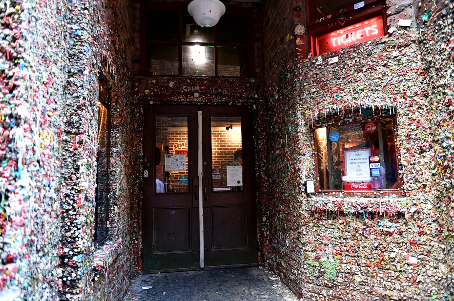西雅圖的口香糖墻名列世界細菌最多的五大景點中的第二位,西雅圖市場劇院有一項古怪的傳統,雖然很臟但挺有趣的:一面滿是口香糖的巨墻。在上個世紀90年代,旅行者們開始在排隊等候的時候把他們嚼過的口香糖粘在這面墻上,十年以來形成了一道五彩繽紛但有點讓人反胃的獨特風景。一些大膽的游客甚至還把他們嚼過的口香糖捏出形狀來。