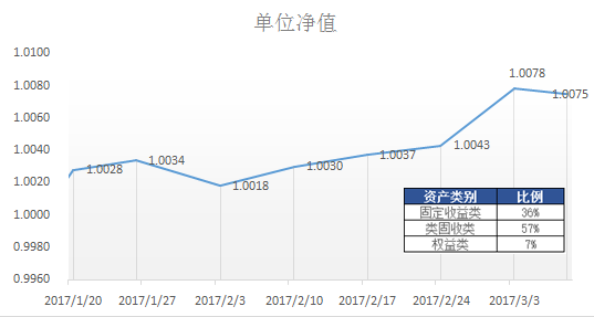 本產(chǎn)品將于2017年3月10日首次開放申購贖回,自2017年1月18日成立以來,截至2017年3月8日,本產(chǎn)品本次開放周期累計凈值1.0075(參考凈值),本開放周期年化收益率5.4655%,成立以來年化收益率5.4655%。